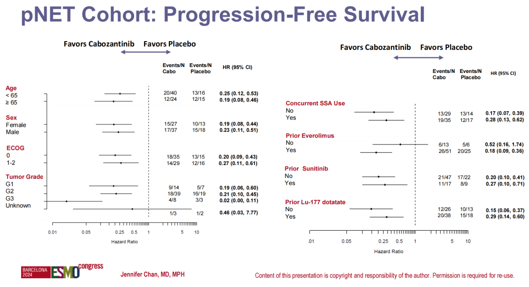 在pNET队列中,卡博替尼组和安慰剂组的中位PFS分别为13.8个体和4.4个月,死亡或进展风险显著降低77%(HR 0.23,95%CI:0.12-0.42,P<0.0001);各亚组的获益趋势一致。BICR评估的PFS在数值上相较于研究者评估的更长,但HR整体上相当。