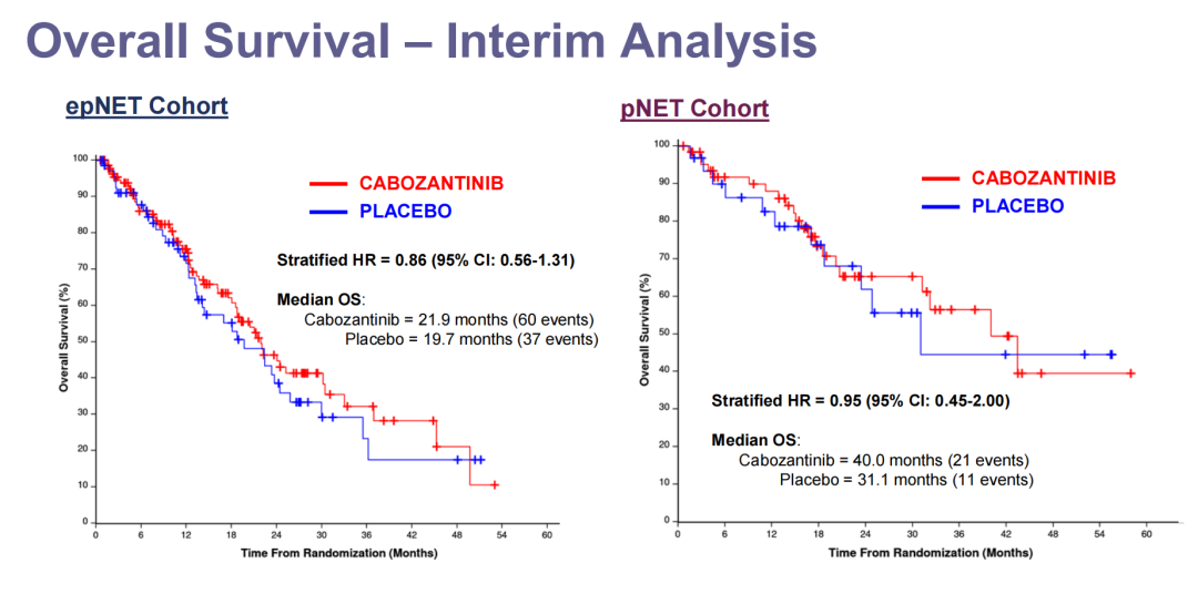 epNET队列和pNET队列中,卡博替尼组对比安慰剂组的ORR分别为5%vs 0%和19%vs 0%。OS数据尚未成熟,epNET队列和pNET队列的OS HR分别为0.86和0.95,PFS能否转化为最终的OS获益仍不得而知。