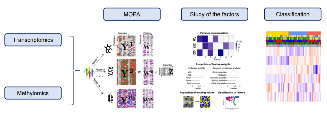 研究人员主要分析样本的转录组学和甲基化特征,使用多组学因子分析(MOFA),构建了一个整合两个组学数据集的8因子模型,从而应用聚类算法来进行分型。