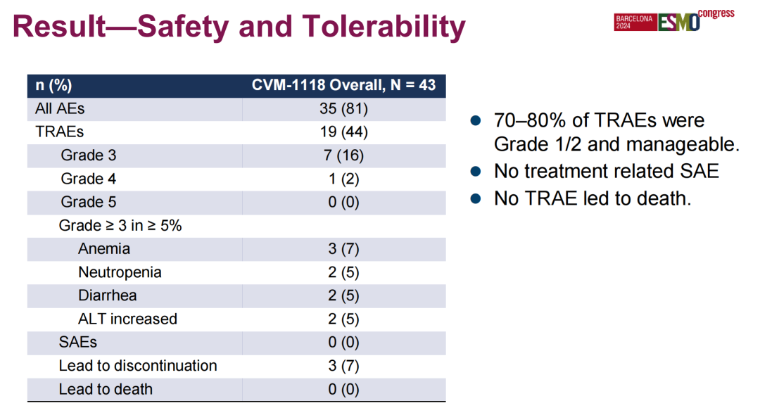 研究结果显示超过了预设目标,总体人群的中位PFS达10.5个月,ORR(CR+PR)为2.9%。对于SSA没有停药的患者,即使用CVM-118联合SSA治疗的患者,中位PFS长达22.4个月。在亚组分析中,胃肠NET、肺NET患者的中位PFS也分别长达22.4个月和25.1个月。安全性也表现出色,大多数为G1/2级不良事件,没有发生严重的治疗相关AE(TRAE),3-4级TRAE发生率仅为18%。