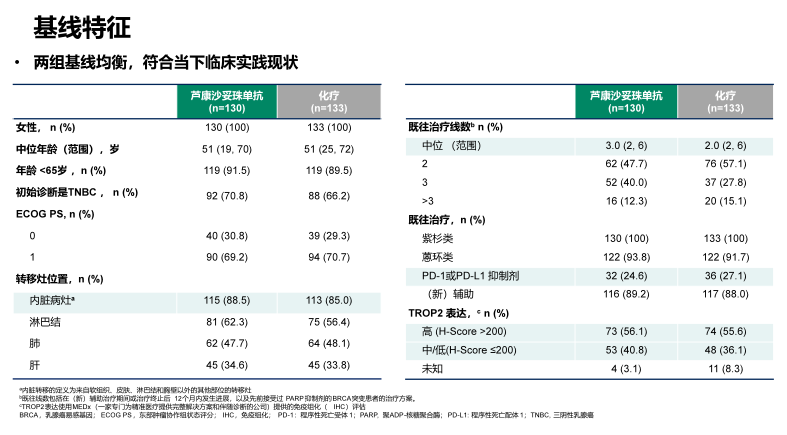 OptiTROP-Breast01研究共入组了263例局部复发或转移性TNBC患者,①针对不可切除,局部晚期或转移性疾病既往接受≥2种化疗方案后复发或难治性,②既往在(新)辅助治疗期间或终止治疗12个月内发生进展的可以算作一种治疗方案,③在任何阶段接受过紫杉类药物治疗。随机分配至芦康沙妥珠单抗组(130例患者)和医生选择的化疗方案组(艾立布林/长春瑞滨/卡培他滨/吉西他滨,133例患者)。主要研究终点是PFS(BICR),次要终点包括:OS、PFS(研究者评估)、ORR、DOR和安全性。分层因素包括:既往治疗线数(2–3 vs>3),存在肝转移(是vs否)(如图2所示)。