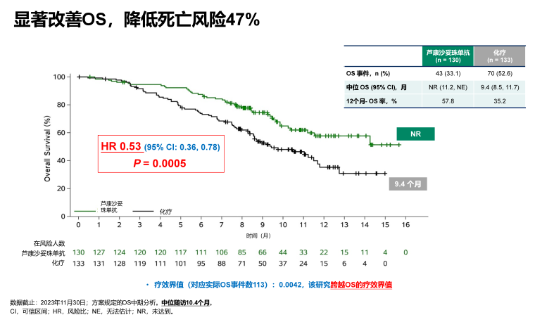 同时,该研究也已经达到关键次要终点OS,芦康沙妥珠单抗组的中位OS尚未达到(NR,95%CI:11.2-NE),相比化疗组,芦康沙妥珠单抗组的OS显示出具有显著统计学意义(HR=0.53,95%CI:0.36-0.78,P=0.0005),并且具有临床意义的改善。
