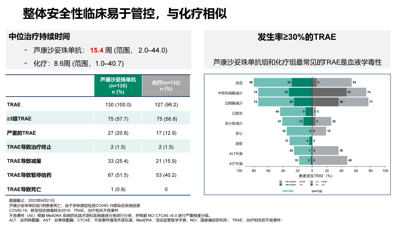 数据截止2023年6月21日,安全性分析结果显示芦康沙妥珠单抗整体安全性良好,与化疗相似。中位治疗持续15.4周,患者因TRAE导致治疗终止的比例为1.5%,因TRAE导致减量的比例是25.4%,导致减量的最常见TRAE是贫血(13.8%)和口腔黏膜炎(5.4%)。最常见的的TRAE是血液学不良反应,贫血80%(≥3级28.0%)、中性粒细胞计数下降74%(≥3级32.0%)和白细胞计数下降74%(≥3级25.0%)。口腔粘膜炎发生率44%(≥3级9%)。