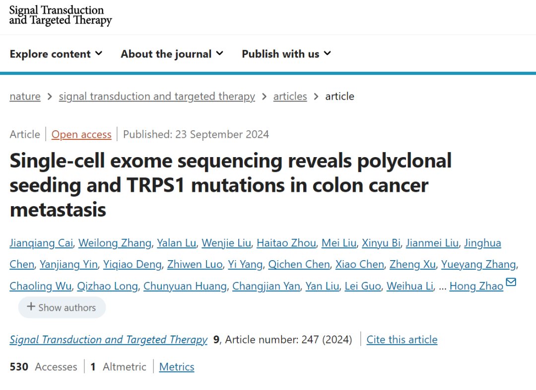 2024年9月23日,中国医学科学院肿瘤医院赵宏教授团队在《Nature》子刊《Signal Transduction and Targeted Therapy》(影响因子:40.8)上发表了题为“Single-cell exome sequencing reveals polyclonal seeding and Transcriptional Repressor GATA Binding 1(TRPS1)mutations in colon cancer metastasis”的文章,在结肠癌肝转移机制上取得了重大突破。该研究对一例Ⅳ期结肠癌患者原发灶、肝转移灶及淋巴结转移灶分离的150个单细胞进行了单细胞全外显子测序,发现转移灶的遗传异质性大于原发灶,表明转移灶起源于多克隆来源的循环肿瘤细胞(CTC)簇。该研究还确定了TRPS1基因突变在结肠癌肝转移中的关键作用,提示TRPS1突变与晚期肠癌的不良预后有关。该研究不仅深化了临床对结肠癌转移过程的理解,也为未来的精准治疗提供了新的潜在靶点。