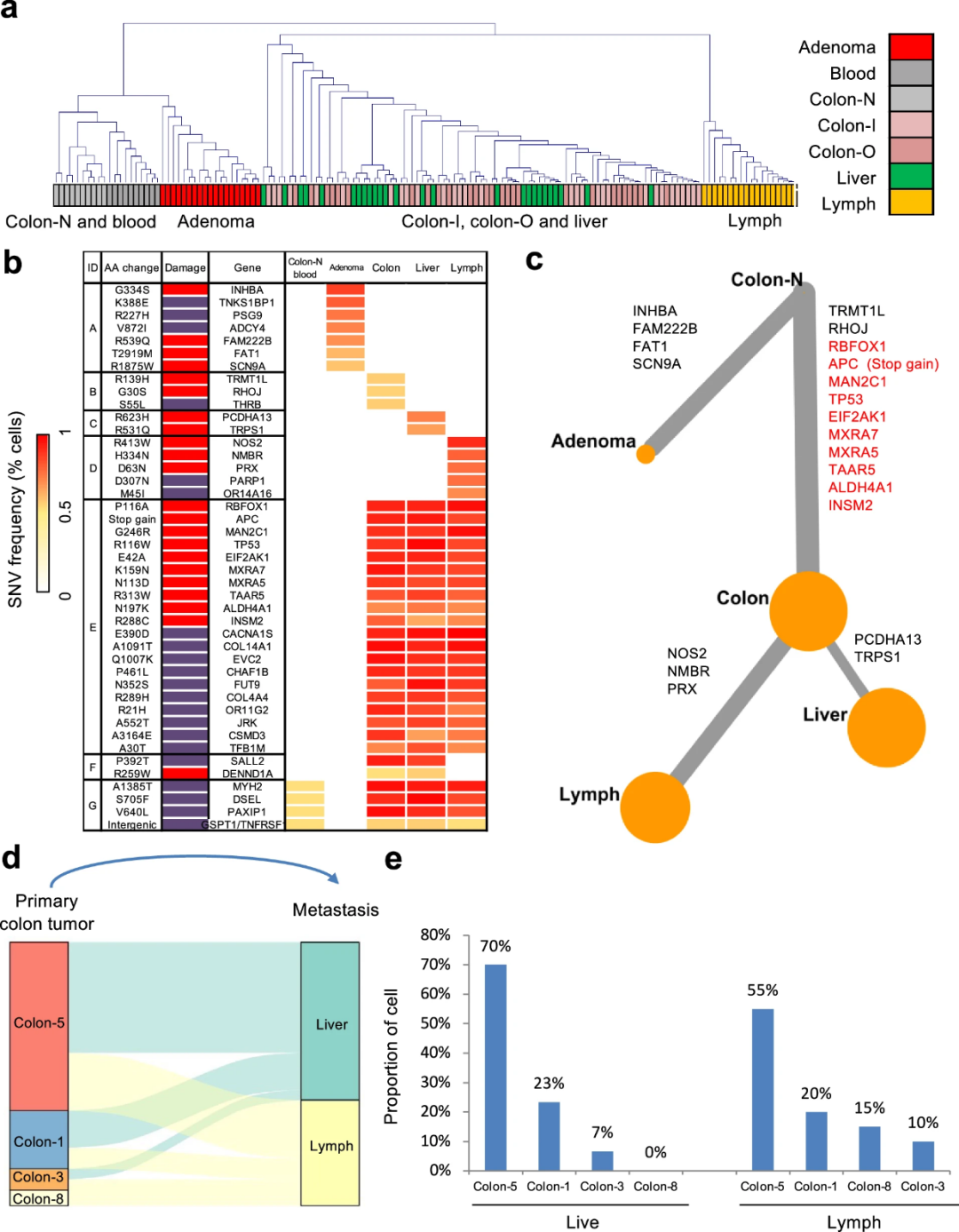 a)IV期结肠癌患者的肿瘤原发灶、肝转移灶、淋巴转移灶和腺瘤的140个单细胞外显子组测序的聚类分析。
