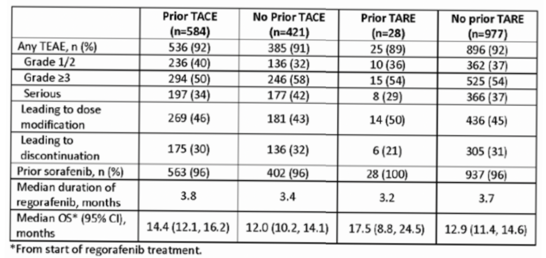 在瑞戈非尼治疗的患者中,与没有接受过TACE的患者相比,接受过TACE治疗的患者具有OS获益。这种趋势在接受过TARE治疗的患者中也较明显,尽管分析中的患者数量很少。
