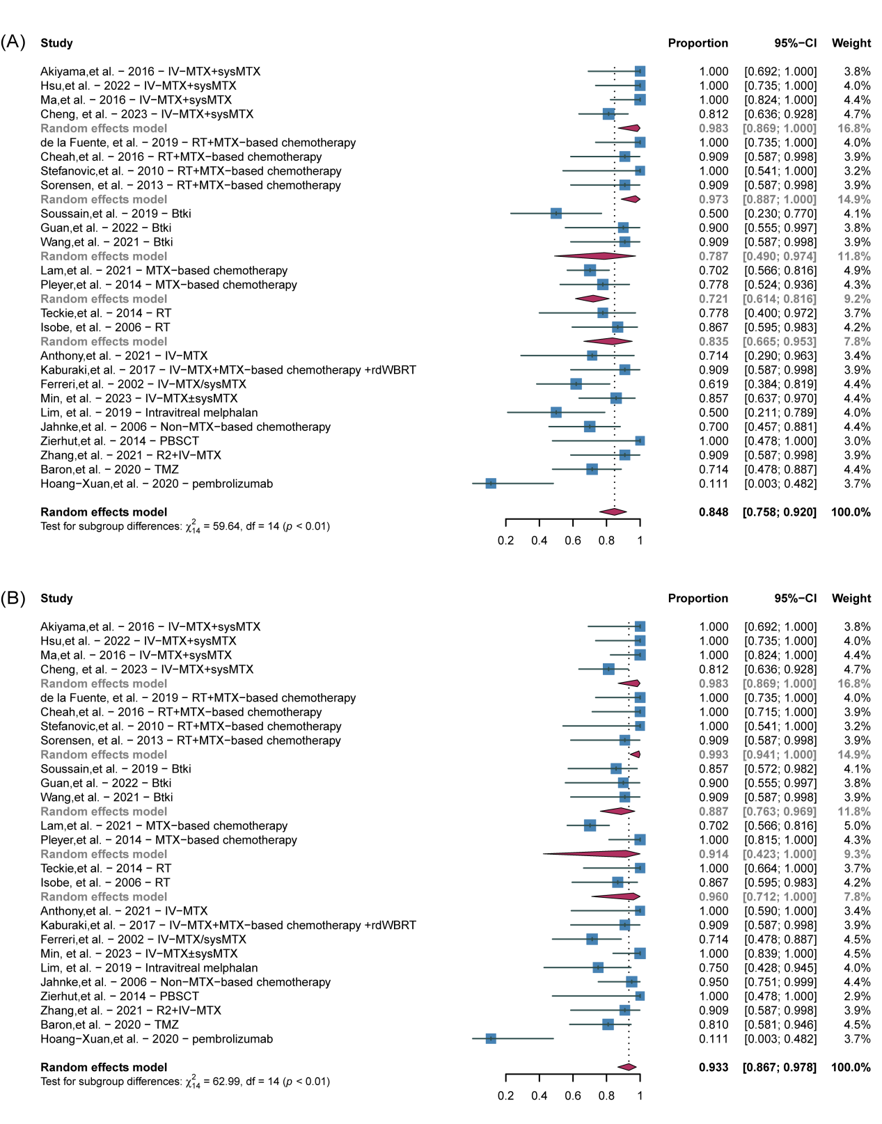 在对治疗方式的疗效进行评估时,我们发现总缓解率(CRR)和客观缓解率(ORR)分别达到了84.8%(95%CI为0.758至0.920)和93.3%(95%CI为0.867至0.978)。特别地,玻璃体内注射小剂量甲氨蝶呤(IV-MTX)与系统性大剂量甲氨蝶呤(sysMTX)的联合使用,以及放疗(RT)与基于甲氨蝶呤的化疗方案联合,均展现了超过90%的高缓解率。相比之下,单独使用口服BTK抑制剂(BTKi)或基于甲氨蝶呤的化疗方案的缓解率相对较低,但仍然超过了70%。其详细结果如图1所示。这些研究结果表明,传统的治疗方法如放疗、IV-MTX和sysMTX对治疗VRL具有显著的疗效。同时,研究还探讨了BTK抑制剂等靶向药物的单药治疗潜力。结合全身和局部治疗策略似乎能够实现更高的缓解效果。