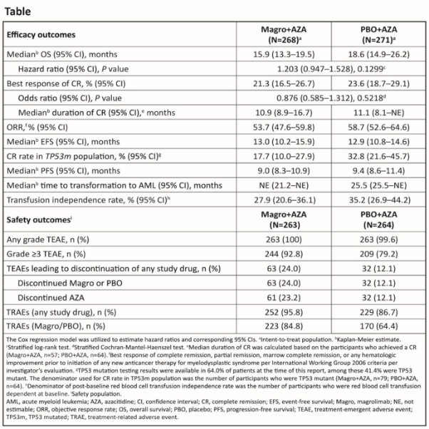 Magro+AZA组的≥3级治疗相关不良事件(TEAEs)和任何级别的治疗相关不良事件的发生频率都较高(见表)。任一组(Magro+AZA和PBO+AZA)中≥20%发生的≥3级TEAEs包括中性粒细胞减少症(44.5%和40.9%)、贫血(42.6%和21.2%)、血小板减少症(40.3%和33.3%)和发热性中性粒细胞减少症(22.8%和18.9%)。2022年4月实施了紧急安全措施(USM;确保在首次接受Magro/PBO的前两剂治疗前24小时内血红蛋白水平≥9 g/dL)。USM在数值上改善了Magro的安全性/耐受性。由于预先指定的中期分析显示无效性,该研究已被终止。后续将进行的疗效亚组分析。