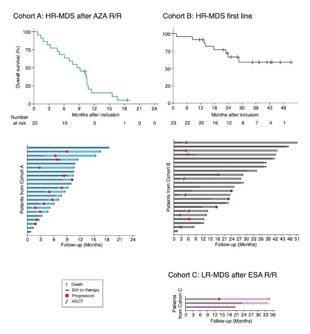 艾伏尼布(Ivosidenib,IVO)是一种口服的靶向小分子IDH1突变体(IDH1m)抑制剂,已被批准与与阿扎胞苷(AZA)联合用于不适合强化疗的成人急性髓细胞白血病(AML)患者,并作为单药用于复发/难治性AML。关于其在IDH1mMDS患者中的疗效知之甚少。IDIOME试验是一项2期单臂研究,评估IVO在三个MDS患者队列中的应用:高危患者AZA治疗失败(R/R)(队列A),一线治疗高危患者(队列B)以及低风险患者EPO治疗失败(队列C)。