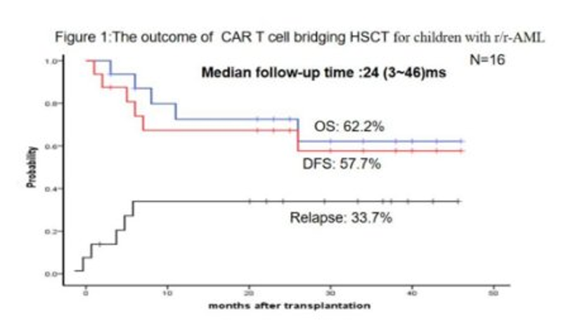 中位年龄为9岁(3~16岁)。患者在淋巴细胞清除预处理后接受了一次或两次CAR-T细胞治疗。其中,9名患者接受了CLL1 CAR-T细胞(8名为自体,1名为异体),2名患者接受了自体CD123 CAR-T细胞,4名患者接受了自体CLL1-CD33复合CAR-T细胞,1名患者接受了来自供体的异体CLL1-CD123复合CAR-T细胞。CAR-T细胞的中位输注数量为0.9×106/kg(范围0.35~2.58×106/kg)。CAR-T治疗后,患者发展为1~2级细胞因子释放综合征,但没有任何致命事件。在CAR-T治疗后4周内通过骨髓评估疾病状态:16名患者中有10名达到形态学白血病无病状态和流式细胞术微小残留病阴性的完全缓解,2名部分缓解,2名病情稳定,另外2名病情进展。所有患者在CAR-T治疗后1个月均有持续的骨髓抑制,随后接受了异基因HSCT。供体来源为半相合供体12例,脐带血3例,无关供体1例。只有1名接受脐带血移植的患者经历了原发性移植失败,并在第二次半相合移植后成功植入。中性粒细胞和血小板植入的中位时间分别为HSCT后28天和32天。从HSCT起的中位随访时间为24个月(范围3~46个月),3年总生存率、无白血病生存率和复发率分别为62.2%、57.7%和33.7%。2~4级急性GVHD(aGVHD)的累积发病率为50%,其中3~4级为6.2%,cGVHD为25%,其中广泛性为6.2%。在5名死亡患者中,4名死于复发,1名死于cGVHD。没有患者发生肝窦闭塞症。