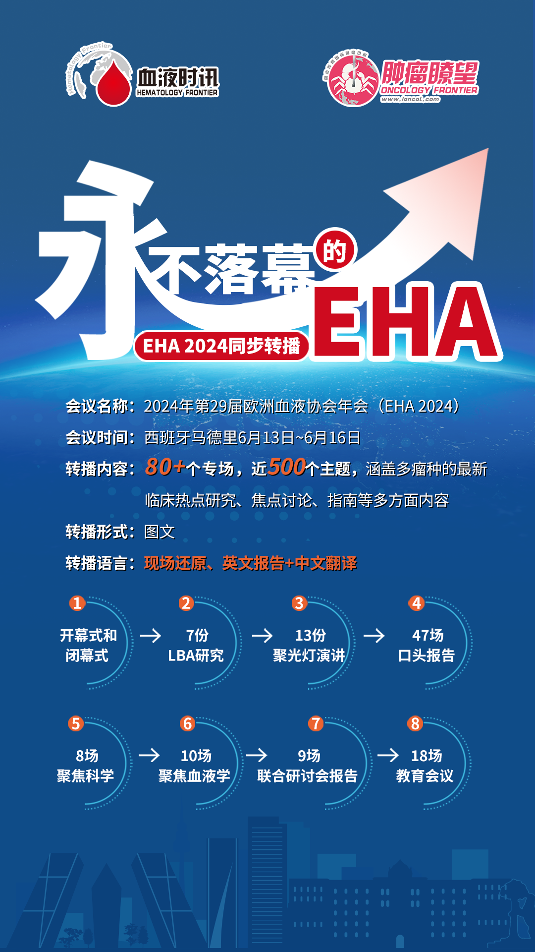 2024年欧洲血液协会年会(EHA 2024)如期而至。为了持续分享和探讨血液学领域的最新研究成果和诊疗经验,《肿瘤瞭望——血液时讯》特别推出“永不落幕的EHA”专栏,专栏将涵盖从恶性血液病到非恶性血液病的最新研究,从精准医疗到细胞疗法的创新等多个领域,旨在为广大血液学专家和医生提供最前沿的学术信息和实践指导。