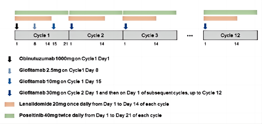 该研究计划招募76例对一线治疗无效或≥2线治疗失败的R/R DLBCL患者。允许患者既往接受过CD19 CAR-T治疗,但排除既往接受过CD20 TCE治疗的患者。所有患者在第1周期中采用格菲妥单抗阶梯剂量递增给药,从2.5 mg递增至10 mg,第2周期D1及以后给予30mg格菲妥单抗。来那度胺(D1-14,20 mg,QD)和poseltinib(D1-21,40 mg,BID)以每3周为1个周期。诱导治疗共12个周期,其后给予poseltinib和来那度胺维持治疗17个周期。主要终点为总缓解率(ORR),次要终点包括缓解持续时间(DoR)、完全缓解率(CRR)、无进展生存期(PFS)、总生存期(OS)和治疗相关不良事件(TEAE)的发生率。
