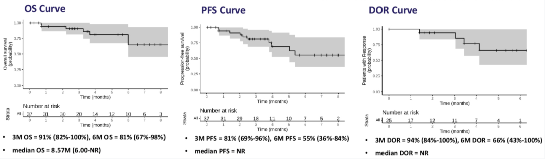 中位随访时间为3.6个月,在28例疗效可评估的患者中,ORR达到89.3%,CRR为42.9%。3个月和6个月的PFS率分别为81%和55%,3个月和6个月的OS率分别为91%和81%,3个月和6个月时的DOR分别为94%和66%(图3)。与第一次中期结果相比,ORR从85.7%提高到了89.3%,CRR从35.7%提高到了42.9%。在18名患者中,有5名(27.8%)从最初的PR成功转为CR。
