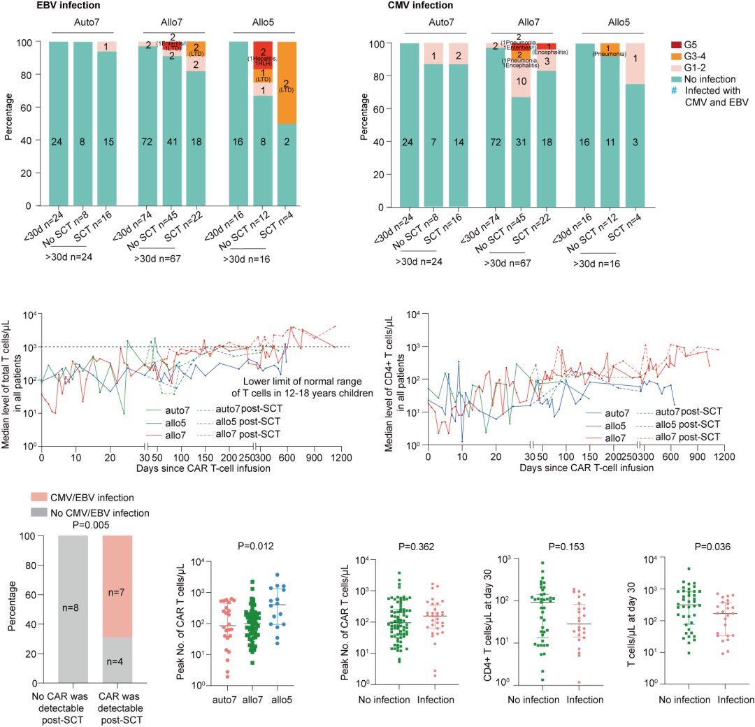 此外,我们还观察到,CD5 CAR-T细胞治疗中的CAR-T细胞扩增峰值高于CD7 CAR-T细胞治疗中的CAR-T细胞扩增峰值(P=0.012),而感染和非感染患者的CAR-T细胞扩增峰值相当(P=0.362)。移植后有11例患者可检测到CAR-T细胞,其中7例有病毒感染,这表明SCT后发生的感染也可能与CAR-T细胞的持续存在有关。