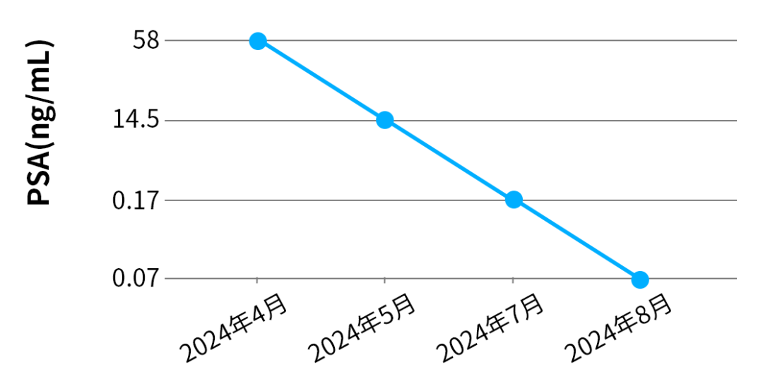 患者家属考虑年龄等问题,选择内分泌治疗方式,自确诊后行内分泌(戈舍瑞林微球联合阿帕他胺)治疗,其PSA快速降低至正常水平。