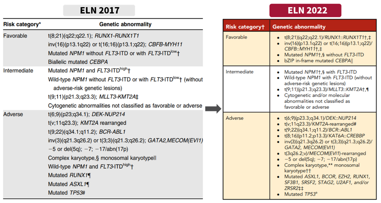 本研究证实,AML的ELN22风险分层适用于接受强化化疗的AML患者(主要是年轻人群)。这使得我们能够有意义地、精确地合并成人AML的细胞遗传学和基因组学数据,并简化了医师进行风险分层的过程。