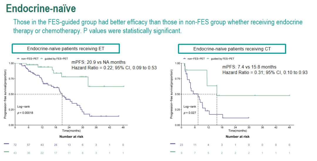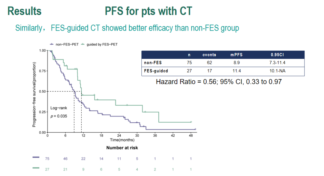 此外,我们还对内分泌耐药患者进行了亚组分析。研究发现,筛查组接受ET治疗的患者中位PFS为28.3个月,未筛查组为16.0个月(HR=0.59;95%CI:0.39~0.88,P=0.0097),获益显著。但在接受CT治疗的患者中未发现这种差异。由此可见,在内分泌耐药的患者中,通过18F-FES PET/CT评估也可以有效地筛选出适合CDK4/6i+ET治疗的患者,这有助于帮这部分患者改善预后。因此,18F-FES PET/CT筛查有望成为HR+/HER2-乳腺癌患者治疗选择的重要参考依据。