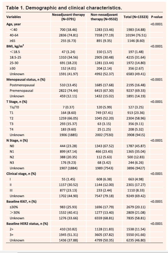 最终入选了符合条件13323例HR+/HER2+早期乳腺癌患者,其中3791例患者接受了新辅助治疗,9532例患者未接受新辅助治疗(表1)。新辅助治疗方案分为仅化疗(化疗,n=963)、化疗+曲妥珠单抗(化疗+T,n=649)、化疗+T+帕妥珠单抗(化疗+TP,n=1,970)、化疗+T+酪氨酸激酶抑制剂(化疗+T+TKI,n=81)和未知方案(n=128)。中位随访时间为13.9个月(范围0.1至48.1个月)。