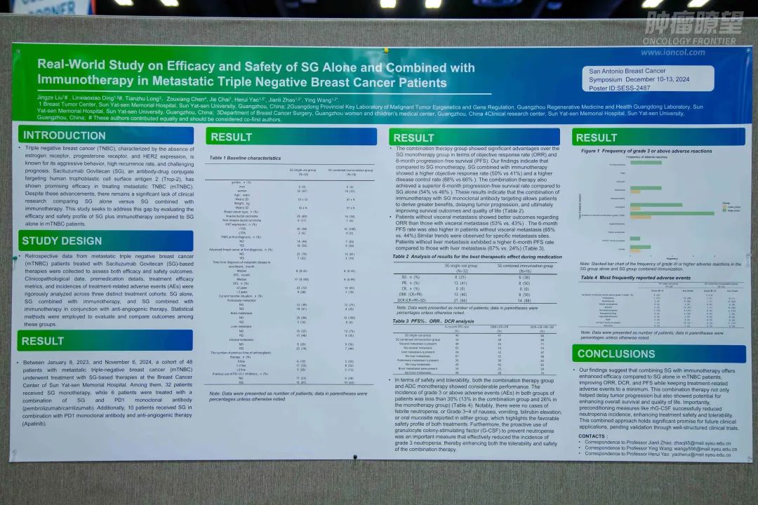 编者按:2024年12月10日-13日,第47届圣安东尼奥乳腺癌研讨会(SABCS)在美国隆重召开,汇聚全球乳腺癌最新前沿进展。曾经,三阴性乳腺癌(TNBC)因缺乏明确的靶点而成为预后最差的癌种之一。如今,靶向Trop-2的抗体偶联药物(ADC)戈沙妥珠单抗(SG)已将TNBC带入ADC时代,较传统化疗有力改善了患者的生存获益。随着SG的可及性提升,其在真实世界应用的疗效和安全性备受关注。此次会上,中山大学孙逸仙纪念医院汪颖教授、赵健丽教授、丁林潇潇教授等发布了一项关于SG±免疫治疗用于mTNBC的真实世界研究结果,为临床进一步探索SG联合免疫治疗提供了参考。