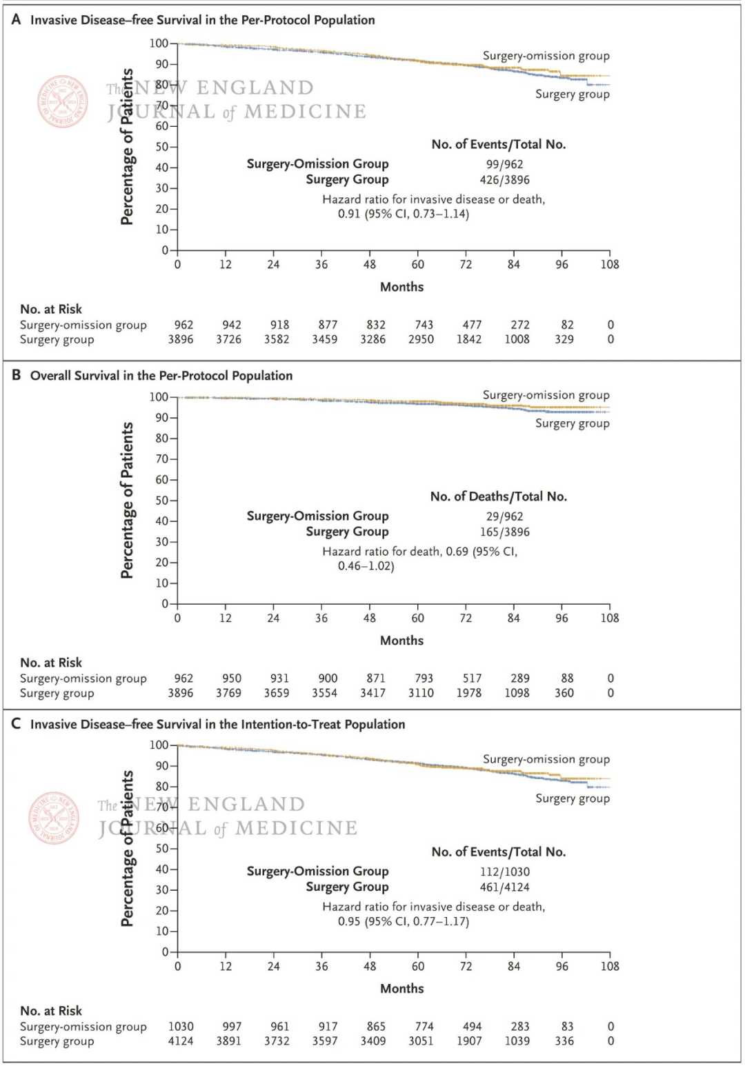 腋窝淋巴结状态是乳腺癌的重要预后因素,指导(新)辅助全身治疗和术后放疗。由于腋窝手术本身并不显著影响乳腺癌死亡率,因此在临床淋巴结阴性患者中,它被视为一种分期程序。二十年前,前哨淋巴结活检(SLNB)取代了腋窝淋巴结清扫(ALND),后来根据ACOSOG Z0011标准省略了完成性ALND(cALND),从而实现了手术降级。Intergroup-Sentinel-Mamma(INSEMA)试验(NCT02466737)旨在探讨在保乳治疗(BCT)中,是否可以避免腋窝手术分期,而不损害肿瘤学安全性。