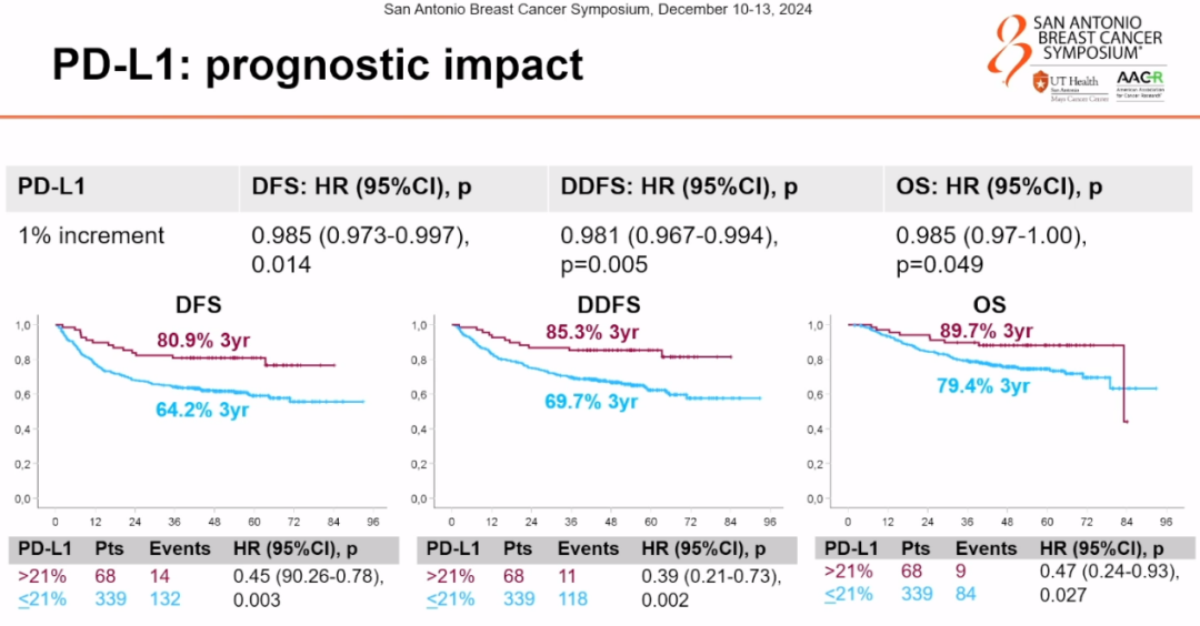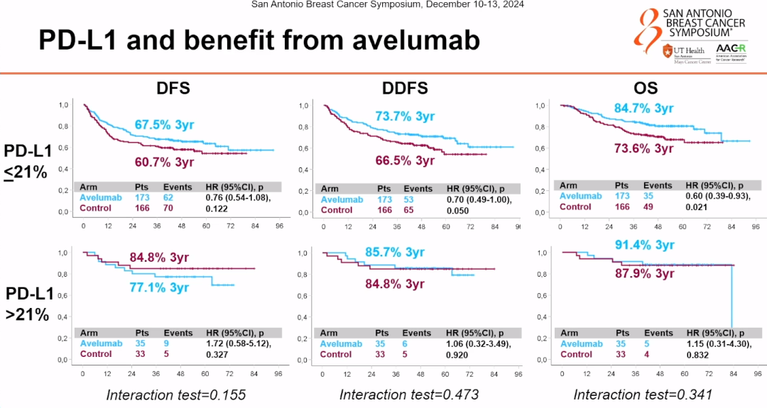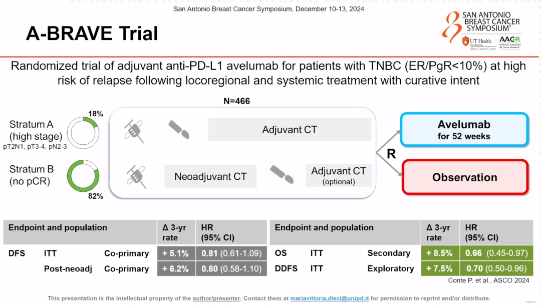 众所周知,A-BRAVE研究是针对早期高危三阴乳腺癌(TNBC)患者的一项重要临床试验,该研究是一项Ⅲ期、多中心、随机临床试验,比较了为期1年阿维鲁单抗辅助强化治疗和观察组在早期高复发风险TNBC中的疗效。去年,该研究的整体结果已经公布,显示阿维鲁单抗强化治疗能够改善患者的OS和DDFS,但未显著延长DFS。而此次,我们主要关注的是该研究中的Biomarker分析(摘要编号:RF3-02)。