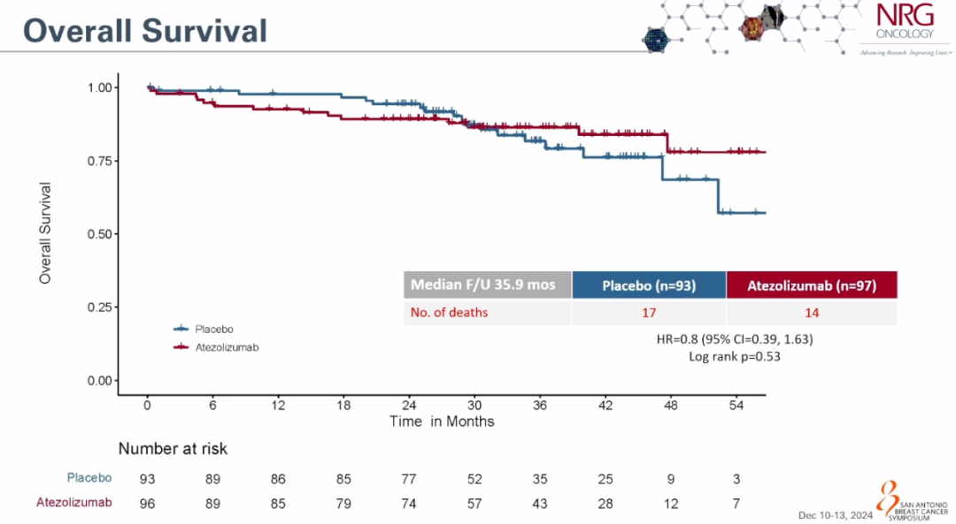 遗憾的是,NRG-BR004研究的结果并未如预期般乐观。该研究旨在比较在THP方案基础上联合阿替利珠单抗与安慰剂组之间的疗效差异,主要终点为PFS。尽管入组患者特征均衡,但研究因为阿替利珠组较多的死亡病例而于2022年5月提前结束入组。最终结果显示,阿替利珠单抗组的PFS并未显著优于安慰剂组。具体而言,阿替利珠单抗-THP组的2年PFS为54.0%,而安慰剂-THP组为45.6%,HR 0.73(95%CI:0.49~1.09)P=0.12。这一结果并未达到统计学显著性。