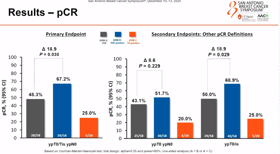 neoHIP是一项针对早期HER2阳性乳腺癌的、多中心、2期、开放标签的临床试验,探索了新辅助(A组)THP vs(B组)THP-帕博利珠单抗vs(C组)TH-帕博利珠单抗的疗效和安全性。该研究入组了年龄≥18岁、未经治疗的II-III期HER2+乳腺癌患者,并根据临床淋巴结状态(阳性或阴性)和激素受体状态(阳性或阴性)进行随机分层。主要终点是pCR;ypT0/Tis ypN0)。次要终点包括根据ypT0ypN0和ypT0/Tis定义的pCR率、RCB、EFS和安全性。