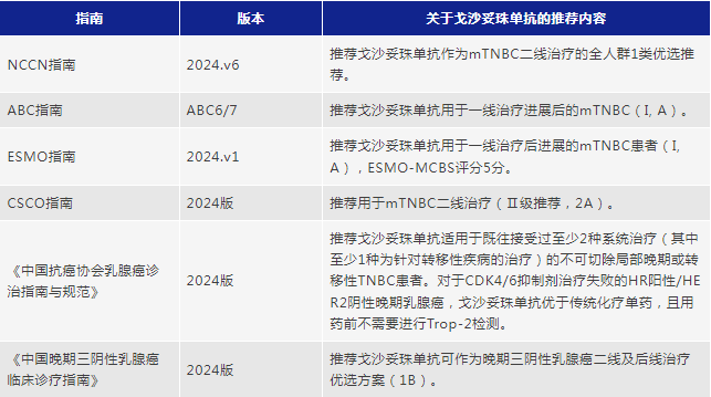 由中国抗癌协会乳腺癌专业委员会和中华医学会肿瘤学分会乳腺肿瘤学组制定的《中国抗癌协会乳腺癌诊治指南与规范(2024年版)》中,戈沙妥珠单抗被纳入指南,并推荐用于既往接受过至少2种系统治疗(其中至少1种为针对转移性疾病的治疗)的不可切除局部晚期或转移性TNBC患者。生物标志物分析结果显示,其疗效不受Trop-2表达水平、HER2 0或低表达的影响均优于对照TPC,目前戈沙妥珠单抗的应用不需要检测Trop-2。