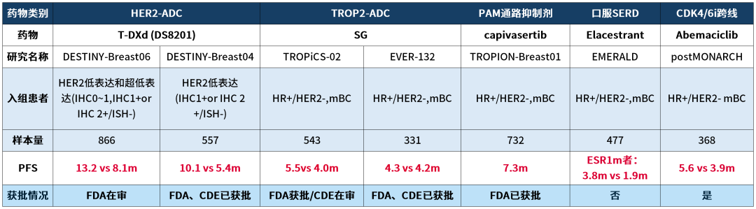 在内分泌治疗方面,今年ASCO报道的postMONARCH研究,是首个CDK4/6i“跨线治疗/再挑战”获得阳性结果的3期临床试验,对于初始CDK4/6i+AI晚期治疗或CDK4/6i+ET辅助治疗失败的患者,接受阿贝西利+氟维司群可相较单药氟维司群显著降低PFS事件风险(HR 0.73),但CDK4/6i再挑战的PFS长度有限,仅为6.0个月(研究者评估)[4]。此外,Elacestrant等新型雌激素受体下调剂(SERD)也是新的治疗选择,主要用于携带ESR1突变患者。