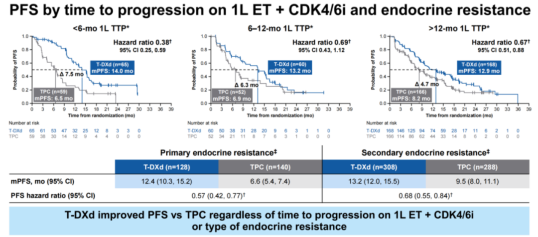 DB-06研究长达13.2个月的中位PFS确实非常抢眼。2024年SABCS大会进一步对DB-06研究中CDK4/6i+ET耐药的人群进行疗效分析[7],结果显示:至内分泌治疗进展(TTP)<6个月(14.0 vs 6.5个月;HR 0.38)、6—12个月(13.2 vs 6.9个月;HR 0.69)、>12个月(12.9 vs 8.2个月;HR 0.67)的患者均有一致的T-DXd治疗获益;TTP<6个月(67.7%vs 25.4%)、6—12个月(60.0%vs 28.8%)、>12个月(59.5%vs 33.1%)的ORR也都显著高于化疗组;根据ESO-ESMO耐药标准评估的原发耐药和继发耐药患者均有一致的T-DXd治疗获益。这些数据表明T-DXd在不同耐药模式人群中均有很好的治疗效果,支持其更早地应用HR+晚期乳腺癌患者。