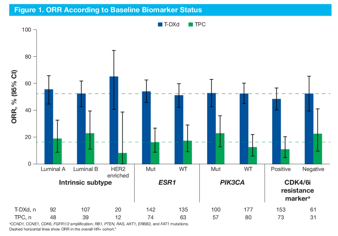 针对CDK4/6i+ET进展后的耐药突变十分复杂,几种信号通路激活可同时发生。DB-04研究曾探索性分析不同耐药突变的影响作用。在HER2低表达、HR+晚期乳腺癌患者中,无论其肿瘤内在亚型如何、是否存在ESR1、PIK3CA突变以及CDK4/6i耐药标志物,T-DXd的ORR均优于化疗[10]。这些数据表明T-DXd能够克服CDK4/6i进展后复杂的耐药突变影响。期待未来DB-06研究的分子生物标志探索分析,提供更多参考信息。
