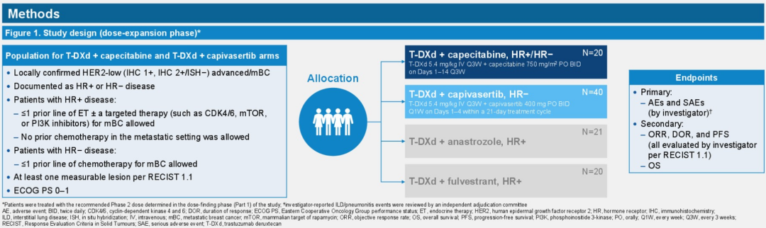 DB-08是一项两阶段、多队列1/2期研究,入组接受过≤1线ET+靶向治疗(CDK4/6i、mTORi或PI3Ki)的HER2低表达(IHC 1+,IHC 2+且ISH-)晚期乳腺癌患者,在T-DXd基础上分别联合卡培他滨、卡匹色替、阿那曲唑、氟维司群等不同队列。去年SABCS大会报道了后2个队列的数据[13]显示,T-DXd+阿那曲唑的ORR为70%,中位PFS为13.4个月;T-DXd+氟维司群的ORR为40%,中位PFS未达到(中位随访8.5个月),且安全性良好,与T-DXd单药治疗基本相当。今年SABCS大会进一步报道了前2个队列的结果[14]。T-DXd+卡培他滨和T-DXd+卡匹色替的ORR均为60%,中位PFS分别为13.4个月和9.0个月,≥3级不良事件发生率分别为55.0%和67.5%。