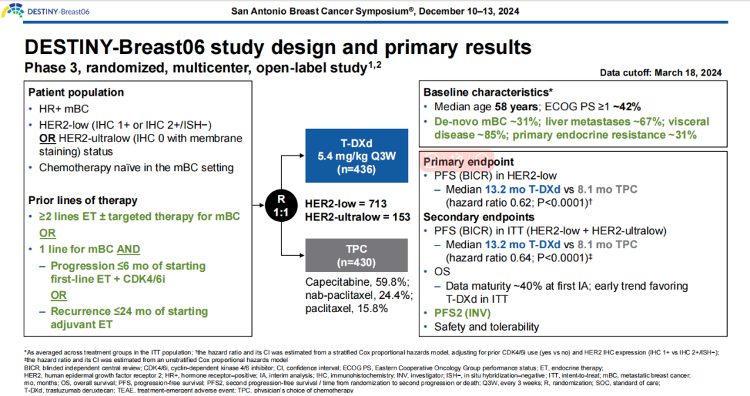 Aditya Bardia,et al.Efficacy and safety of trastuzumab deruxtecan(T-DXd)vs physicians choice of chemotherapy(TPC)by pace of disease progression on prior endocrine-based therapy:additional analysis from DESTINY-Breast06.2024 SABCS.Abstract LB1-04.