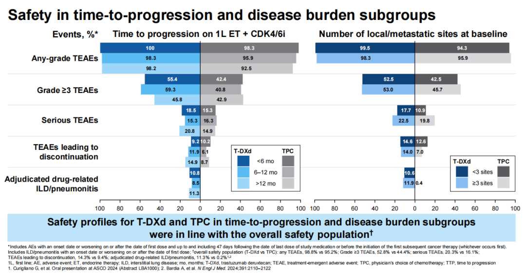 在研究者评估的原发性和继发性内分泌耐药患者中,疗效结局一致。在TTP亚组分析中,接受T-DXd和TPC的患者发生≥3级治疗相关不良事件的发生率与总体安全性人群一致(<6个月:55.4%vs 42.4%;n=124;6~12个月:59.3%vs 40.8%;n=108;>12个月:45.8%vs 42.9%;n=329)。