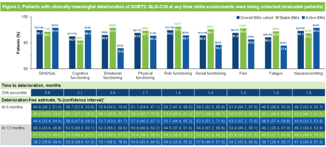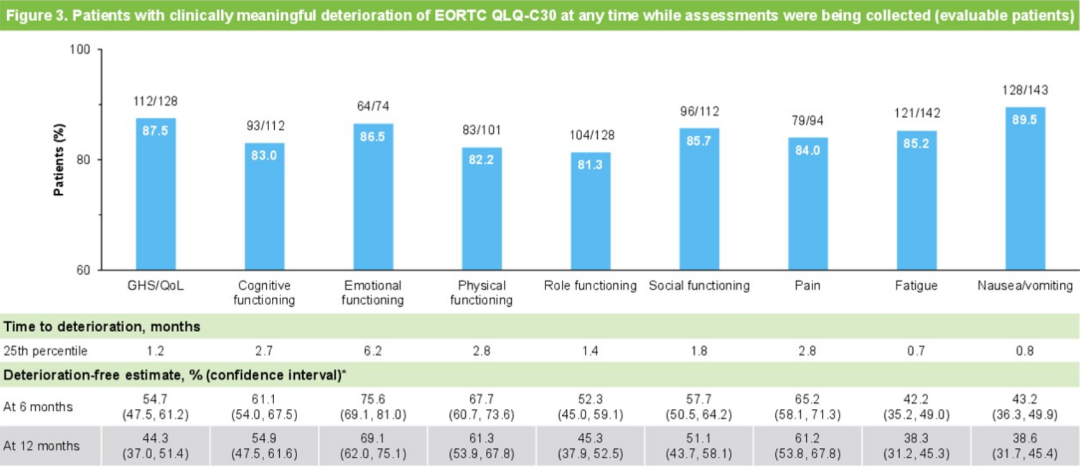 在非脑转移队列(N=241)中,中位T-DXd治疗时间为12.0个月,至数据截止时,有95例患者仍在继续接受治疗。有4例患者出现新发症状性CNS转移,发病率为1.7%。通过EORTC QLQ-C30评估患者的认知、情绪、躯体功能、社会功能和疼痛等,预估12个月无恶化率>50%。