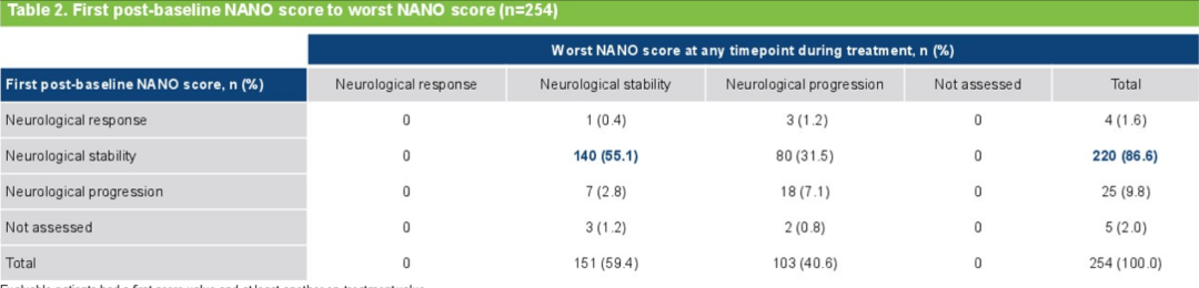使用NANO量表评估神经功能(见下图),共有220/254(86.6%)例患者在首次评分时神经功能状态稳定,其中140例(55.1%)患者在T-DXd治疗期间仍维持神经功能稳定。并且有相当比例(18/25,72%)的基线神经系统功能障碍的患者经T-DXd治疗神经功能可恢复稳定。