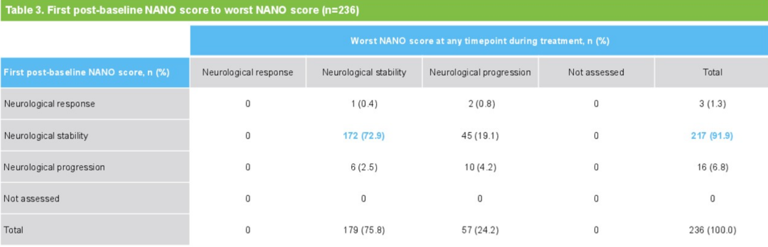 NANO评估显示,共有217/236(91.9%)例患者基线时神经功能稳定:其中,172例(72.9%)患者在T-DXd治疗期间神经功能稳定,45例(19.1%)发生神经功能恶化。有相当比例(6/16,37.5%)基线评估为神经功能障碍的患者,在T-DXd治疗期间神经功能可恢复稳定。