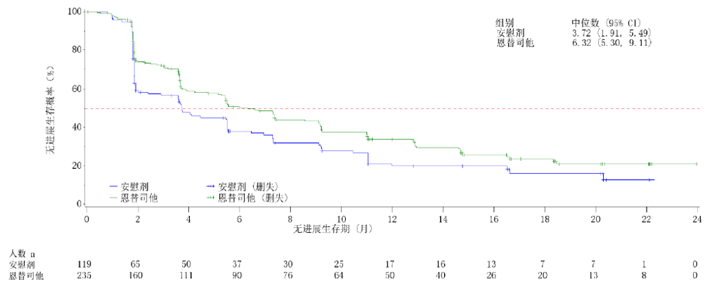 EOC103A3101研究[14]纳入了354例经治的HR+/HER2-晚期乳腺癌患者,既往治疗包括化疗、内分泌治疗、CDK4/6i等,试验组中有32.3%的患者为原发性内分泌耐药。研究的主要终点结果显示,恩替司他可相较于安慰剂组显著改善无进展生存期(PFS:6.32 vs 3.72个月,HR 0.76,95%CI:0.58~0.98,P=0.046),次要终点显示恩替司他组患者的总生存期(OS)长达38.39个月,相较于安慰剂组的9个月延长近30个月(HR 0.83)。