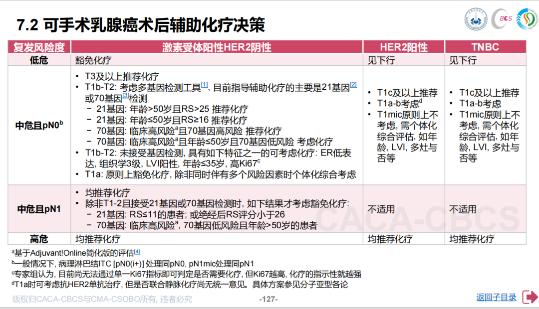 更新重点:对于具有争议的pT1mic患者的风险分层和治疗决策,新版小红书在浸润性乳腺癌复发转移风险评估章节进行了更新,表述为“低危增加:三阴性或HER2阳性,且pT1mic”。同时,在不同类型pT1mic乳腺癌患者中,对其予以风险度分层单列并推荐的相应的治疗方案。