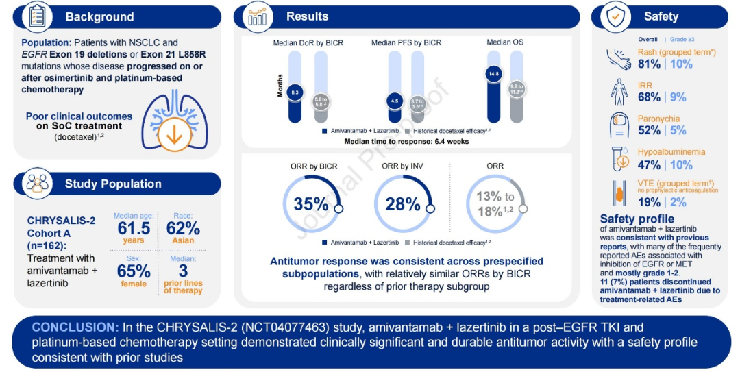 研究题目:埃万妥联合雷泽替尼治疗EGFR突变且奥希替尼及含铂双药治疗耐药的晚期非小细胞肺癌患者:CHRYSALIS-2队列a研究数据