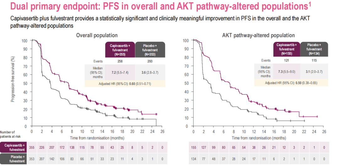 王树森教授:PAM通路在乳腺癌的发生发展中发挥着重要作用。PAM通路基因变异在乳腺癌中非常普遍,PI3K和AKT的异常活化或者PTEN的缺失都可导致PAM信号通路的异常激活。PAM通路的异常激活会导致患者更容易对内分泌治疗、化疗以及靶向治疗耐药,因此,聚焦于PAM通路药物的研发一直是10余年来的热点,在近两年中,又有一些新的成果公布。mTOR抑制剂依维莫司多年前就已经获批用于治疗HR+/HER2-晚期乳腺癌患者;随着INAVO120研究结果的公布,我们看到了PI3Ka抑制剂Inavolisib在HR+/HER2-晚期乳腺癌患者治疗中与哌柏西利和氟维司群联合使用带来的PFS的改善;AKT抑制剂Capivasertib联合氟维司群的CAPItello-291研究结果的公布,让我们看到了该方案较安慰剂组显著改善了HR+/HER2-晚期乳腺癌患者的PFS(7.2个月vs 3.6个月;HR=0.60,P<0.001)。特别是在AKT通路改变的患者中,PFS也有了大幅度的提高(7.3个月vs 3.1个月,HR=0.50,P<0.001)。