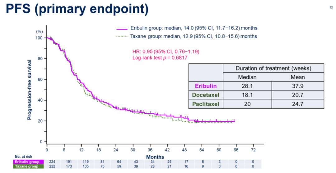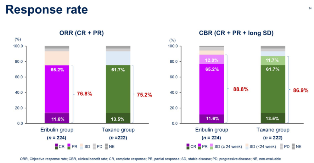 此外,客观缓解率(ORR:76.8%vs.75.2%)、临床获益率(CBR:88.8%vs.86.9%)在数值上也高于紫杉组;OS结果尚未成熟;在安全性方面,艾立布林的皮肤毒性、水肿等不良事件发生率更低。