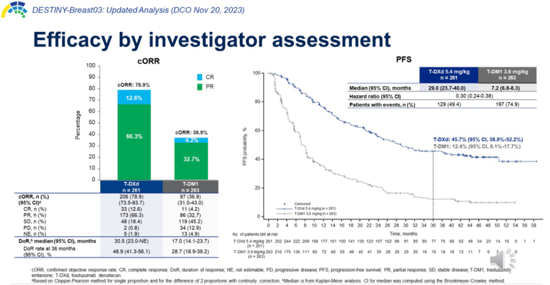 ORR:T-DXd组的ORR率为78.9%(206名患者),而T-DM1组为36.9%(97名患者),显示出T-DXd在提高反应率方面的显著优势。CR率为12.6%和4.2%。反应持续时间(DoR):研究者评估的T-DXd组中位DoR为30.5个月,而T-DM1组为17.0个月,表明T-DXd治疗的反应更持久。