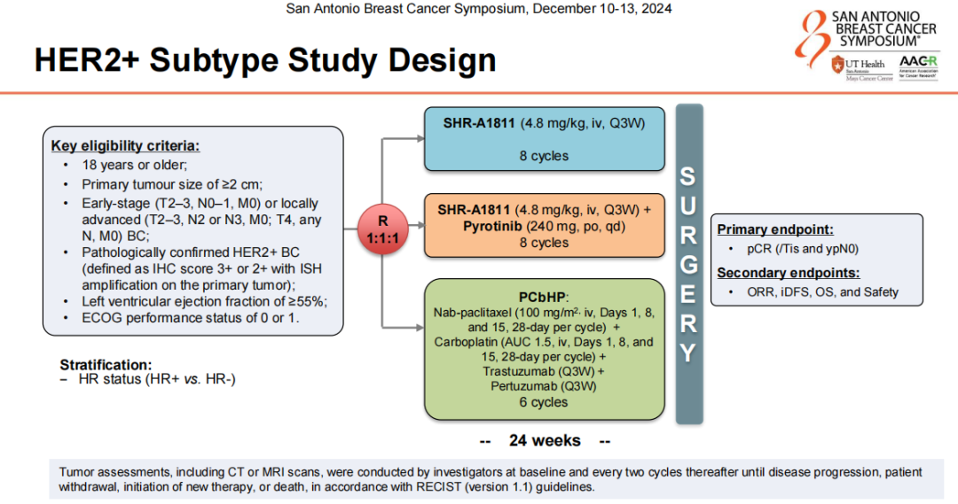HER2阳性队列265例患者按1:1:1随机分配至SHR-A1811单药组(n=87)、SHR-A1811+吡咯替尼组(n=88)和白蛋白结合型紫杉醇+卡铂+HP(PCbHP)组(n=90),分别接受8周期、8周期和6周期的新辅助治疗。主要研究终点是意向治疗(ITT)人群的pCR,次要终点包括客观缓解率(ORR)、侵袭性无病生存期(iDFS)、总生存期(OS)以及安全性。