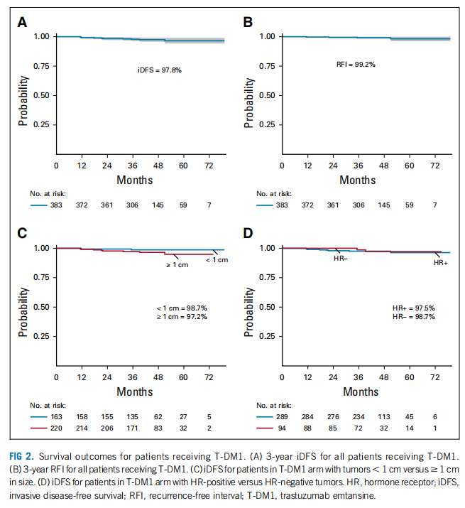 ATEMPT是一项多中心、随机、Ⅱ期试验,旨在评估为期1年的T-DM1辅助治疗的疗效,并与TH比较在中心确诊的Ⅰ期HER2阳性乳腺癌患者中临床相关毒性的发生率。主要终点为T-DM1与TH方案组的临床相关毒性发生率和T-DM1治疗组患者的iDFS。次要终点是无复发间期(RFI),相关分析包括HER2DX基因组工具、HER2异质性的多组学评价和血小板减少的预测因素。