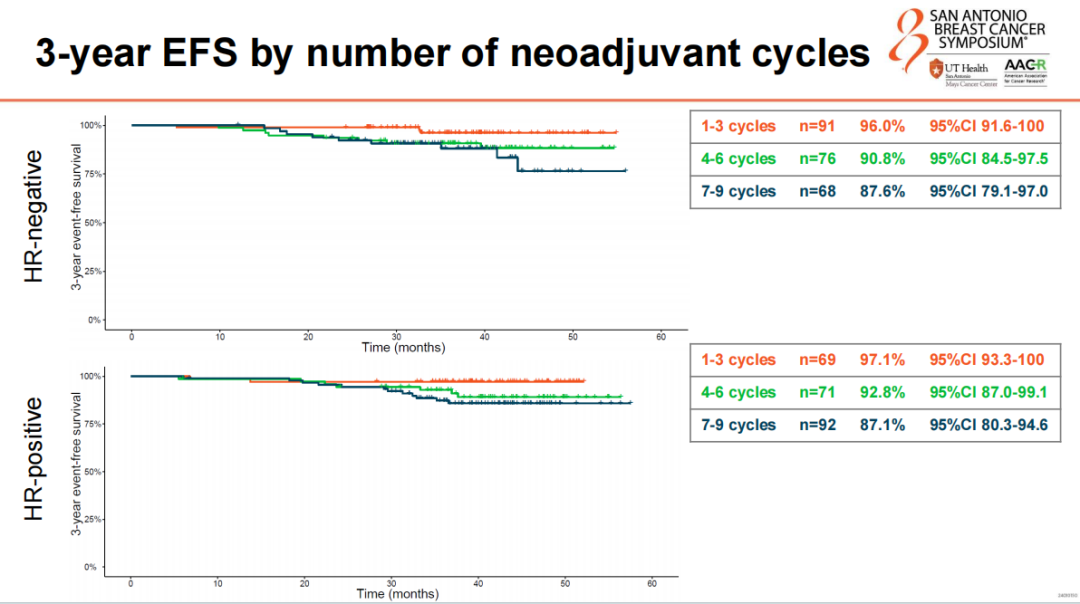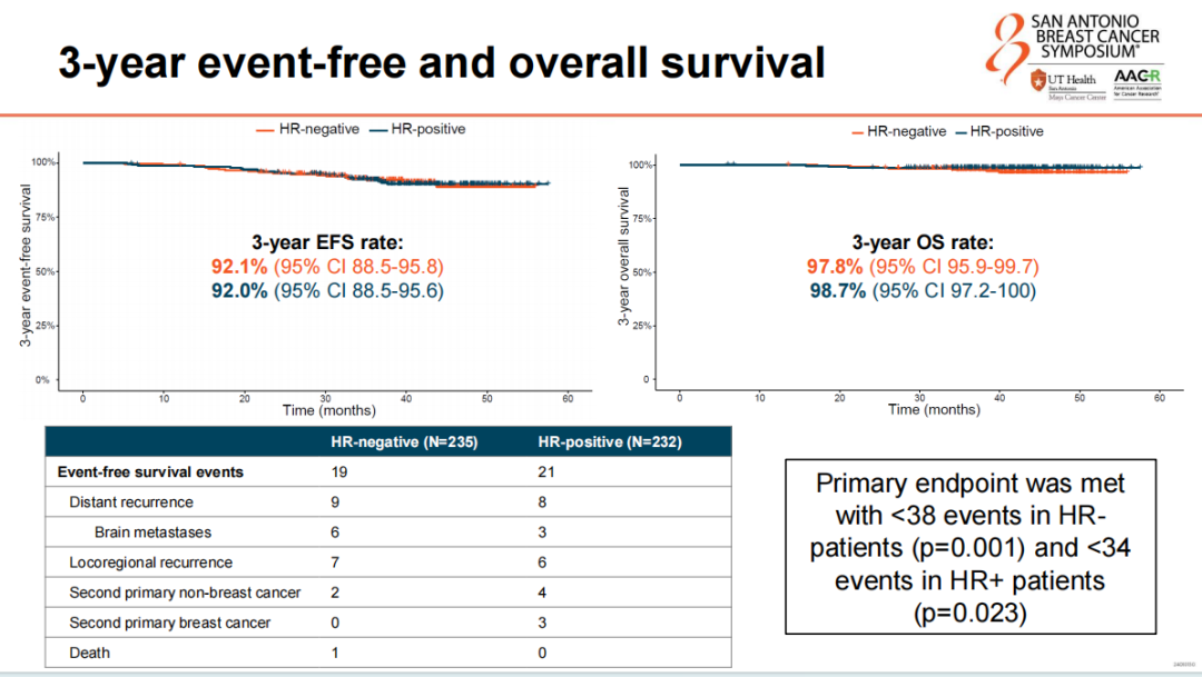 共有235例HR-患者接受了1-3个周期(n=91,38.7%)、4-6个周期(n=76,32.3%)或7-9个周期(n=68,28.9%)的PTC-Ptz治疗。232例HR+患者接受了1-3个周期(n=69,29.7%)、4-6个周期(n=71,30.6%)或7-9个周期(n=92,39.7%)的PTC-Ptz治疗。中位随访时间为39.7个月(IQR 34.8-45.4),HR-亚组的3年EFS率为92.1%(95%CI:88.5~95.8%),3年OS率为97.8%(95%CI:95.9~99.7%)。HR+亚组的3年EFS率为92.0%(95%CI:88.5~95.6%),3年OS率为98.7%(95%CI:97.2~100%)。