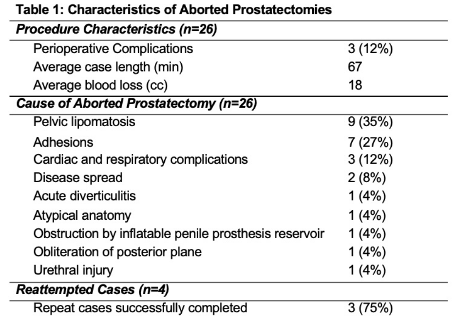 西北纪念医院中有11名外科医生符合纳入标准。在这11名外科医生中,共尝试了3,789例根治性前列腺切除术,包括开放式手术(n=470)和机器人手术(n=3319)。其中3763例(99.31%)手术完成,26例(0.69%)手术中止。所有26例中止手术均由机器人完成。