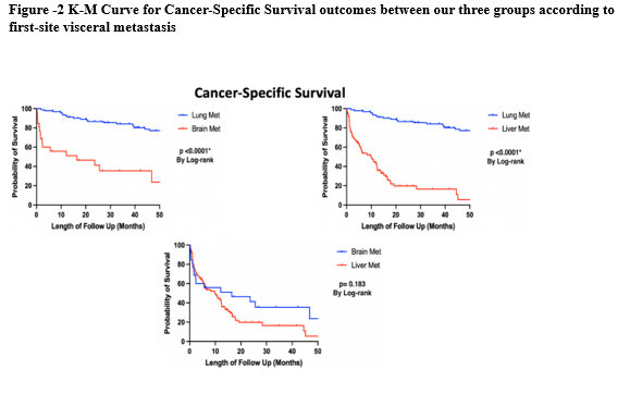这是一项回顾性分析,研究者从梅奥诊所晚期前列腺癌登记处确定了203名患有内脏转移的前列腺癌患者。根据首次检测到的内脏转移部位,将患者分为三组:肺、脑或肝。内脏转移主要通过代谢成像(11C-胆碱)或PSMA PET-CT扫描检测。内脏转移的诊断可通过活检(如果可行)或常规成像(包括CT或MRI)进行确认。使用Kaplan-Meier估计总生存和肿瘤特异性生存。进行单变量和多变量Cox回归模型以评估影响总生存和肿瘤特异性生存的相关变量。