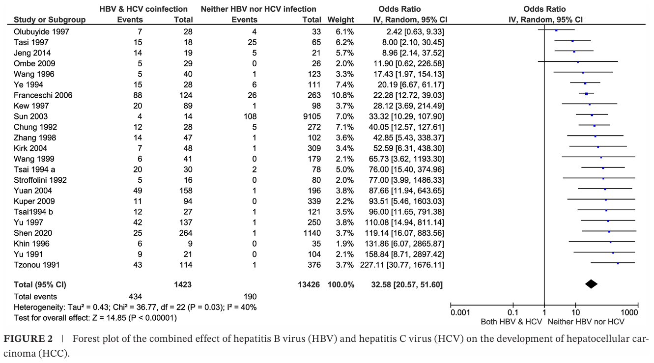 这项荟萃分析表明了HBV、HCV和饮酒等因素对HCC风险的综合影响。其中,HBV和HCV共同感染可显著增加HCC发展风险,超过32倍(OR=32.58);在HBV或HCV存在的情况下,饮酒会显著增加HCC发展风险,分别超过14倍(OR=14.56)和42倍(OR=42.44)。