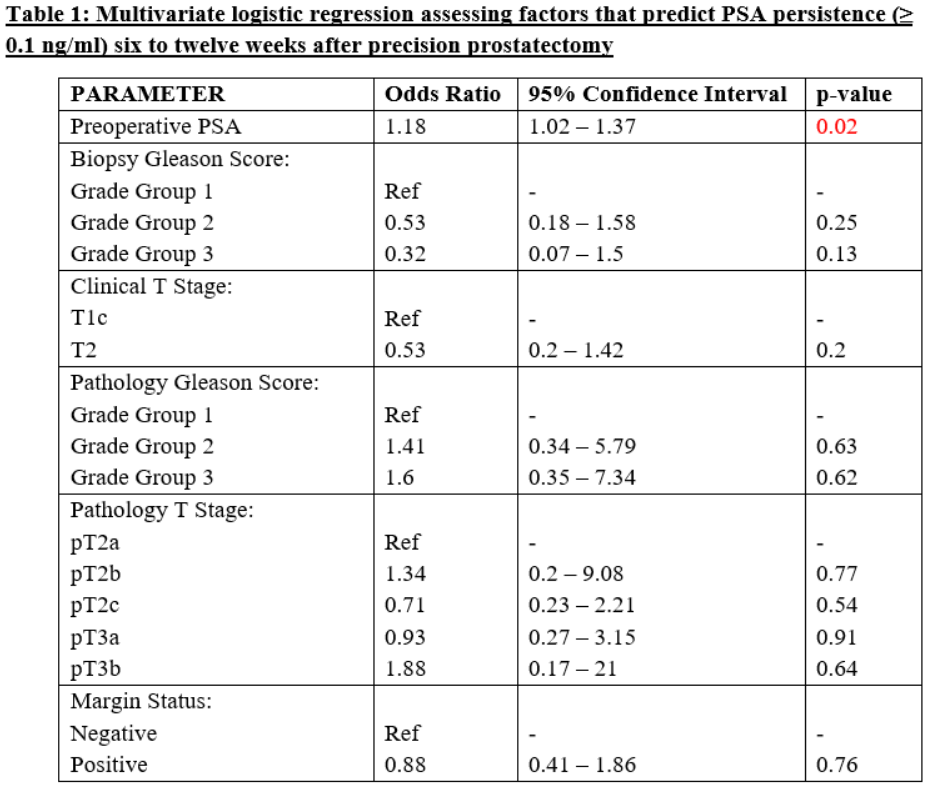 该研究为一项前瞻性单组研究的一部分,纳入患者为前列腺癌等级≤3且PSA水平≤20 ng/ml,为优先考虑维持勃起功能的患者提供MPP治疗。患者在术后6-12周内接受PSA检测,然后每3个月进行一次PSA检测,并在术后10-18个月对残留前列腺进行活检,无论术后PSA水平如何。残留活检确认为2级或更高级别前列腺癌的患者接受完全前列腺切除术或挽救性放射治疗。对术后PSA水平是否持续升高(定义为6-8周时PSA>0.1 ng/mL)进行分组,进行Kaplan-Meier分析以评估治疗失败的情况。随后进行逻辑回归分析以确定与术后PSA持续升高的相关因素。